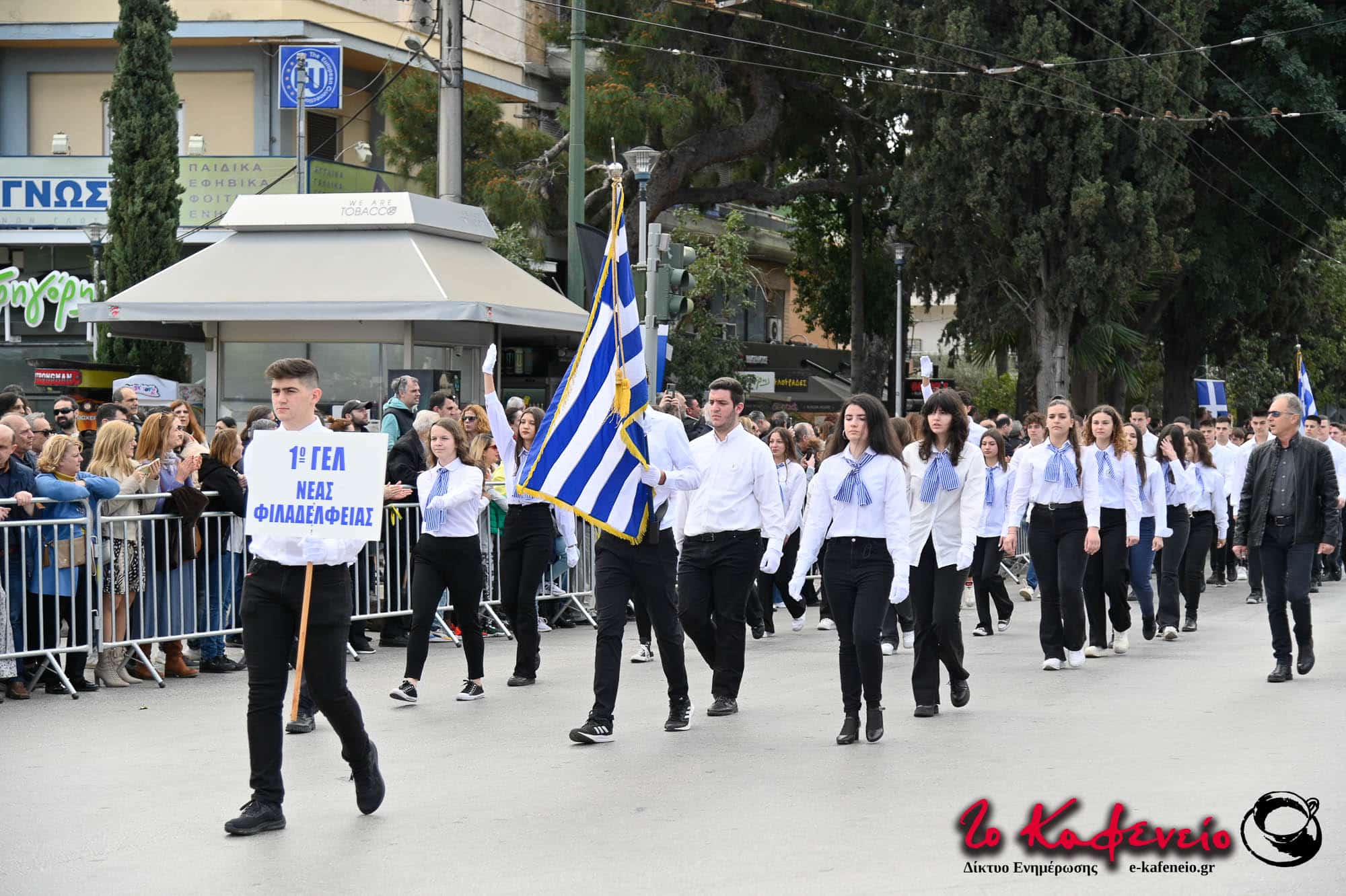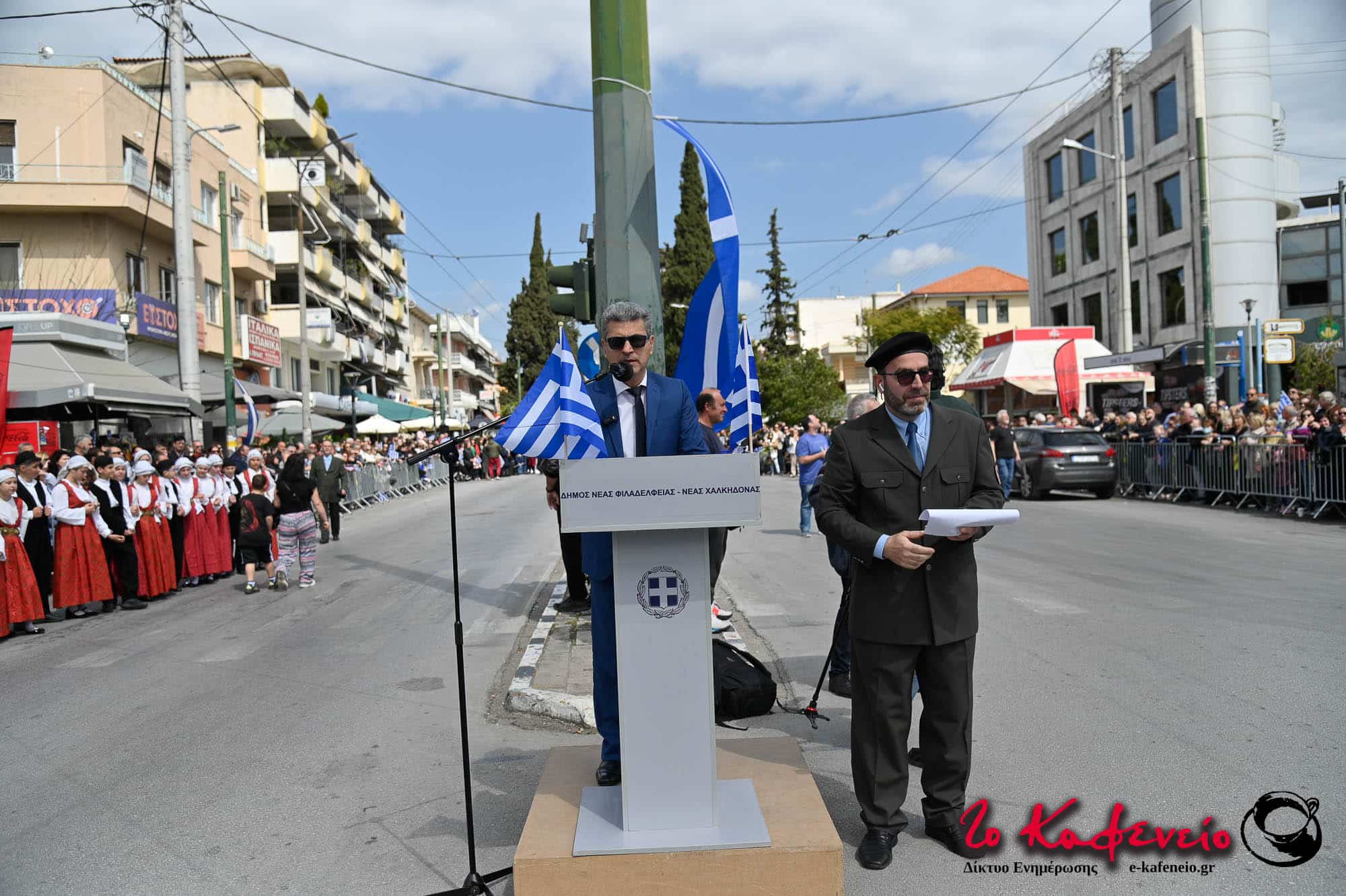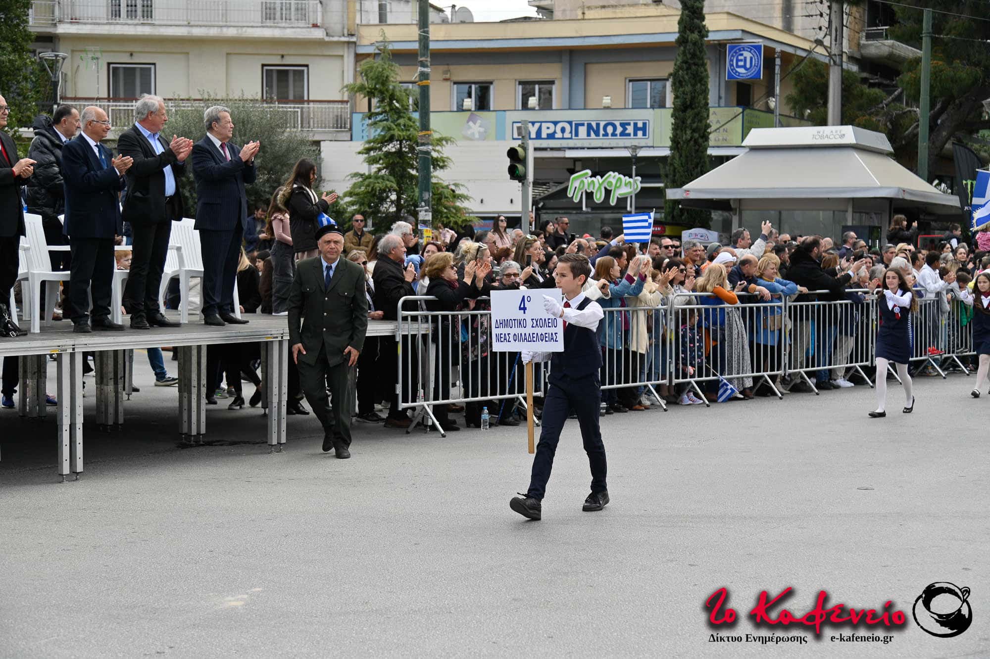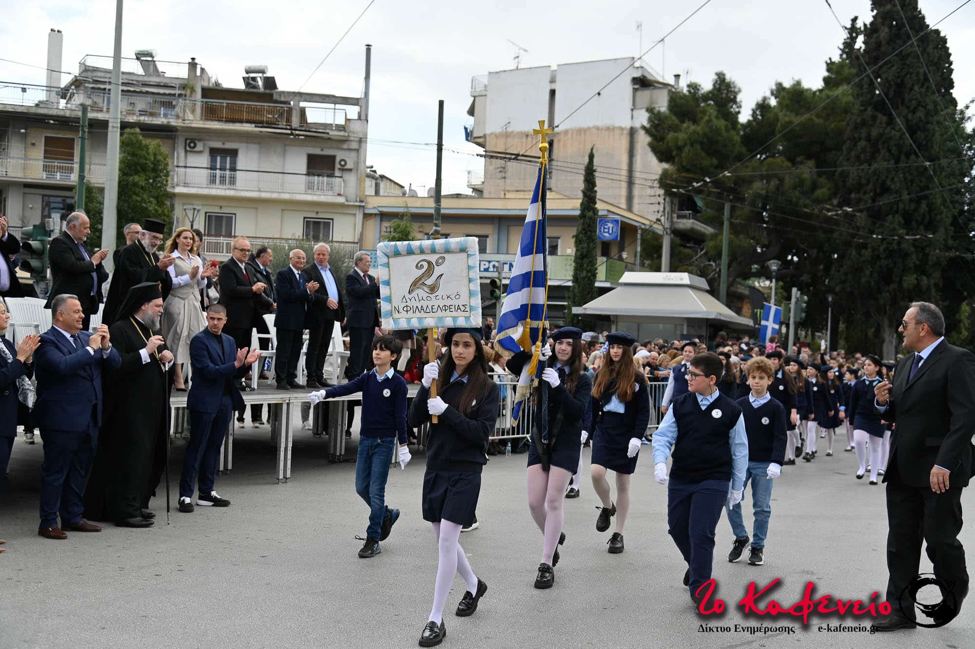Οι εκδηλώσεις συνεχίστηκαν στην κεντρική λεωφόρου, με το χορευτικό τμήμα του δήμου να παρουσιάζει παραδοσιακούς χορούς από διάφορα μέρη της Ελλάδας και τους συλλόγους και τα σχολεία της πόλης μας να παρελαύνουν υπό την εκφώνηση του τελετάρχη κ. Μπέτζελου. Ξεχωριστή παρουσία φέτος είχε η σημαία για τα 100 χρόνια από την ίδρυση της Νέας Φιλαδέλφειας – Νέας Χαλκηδόνας.
