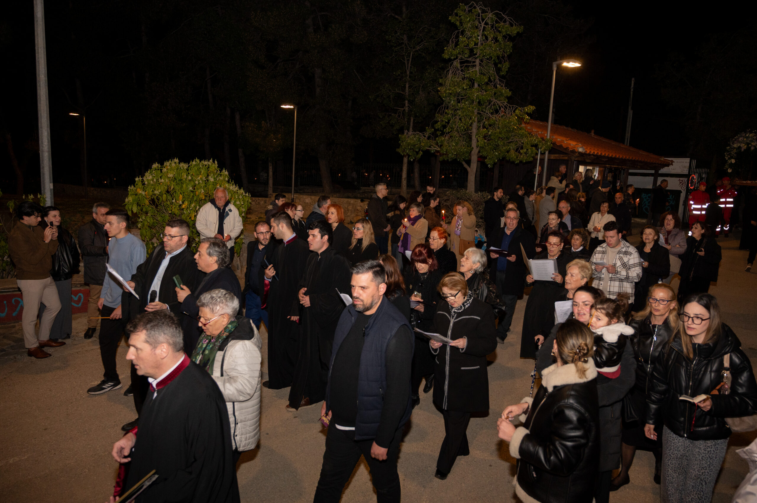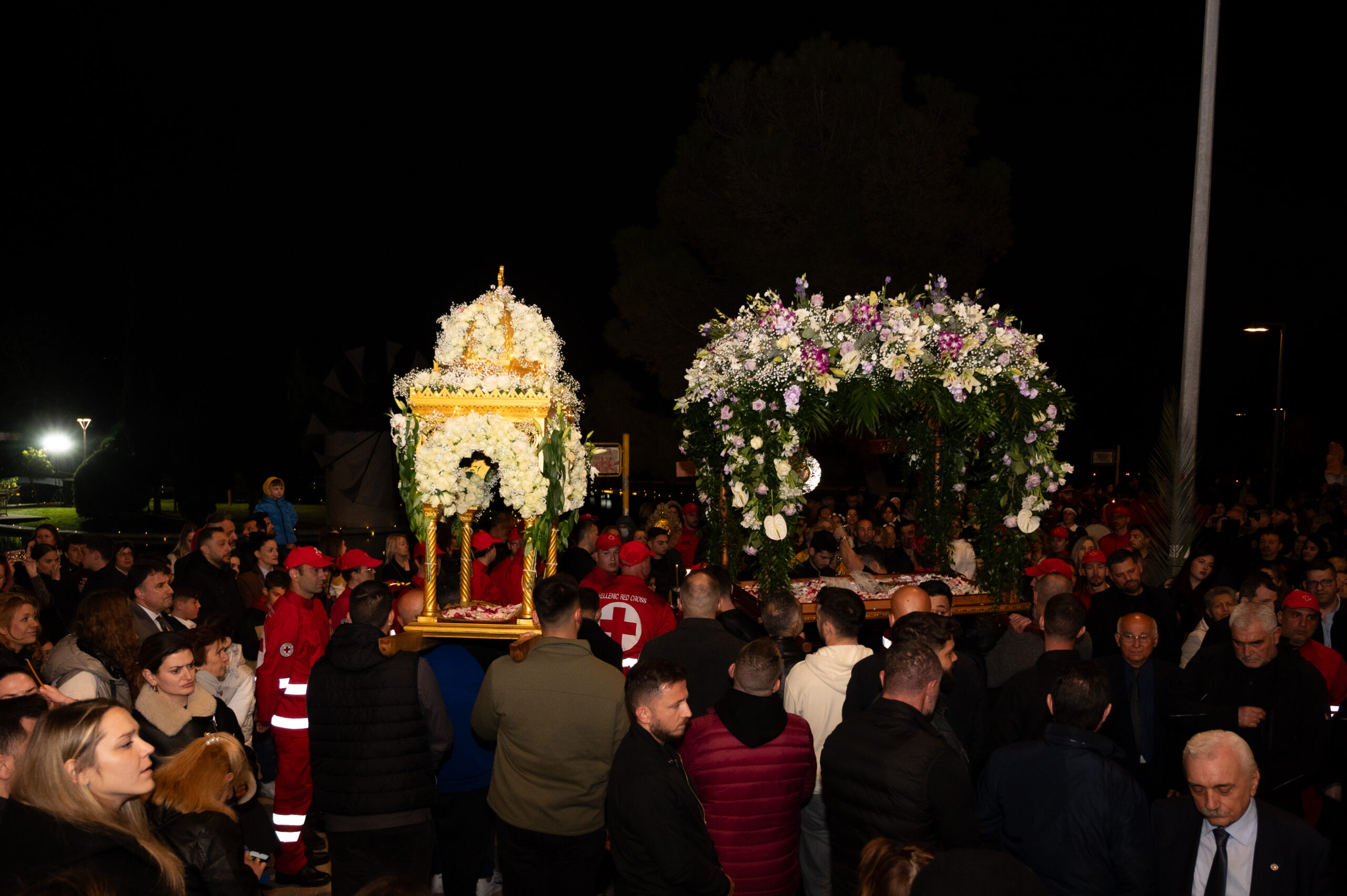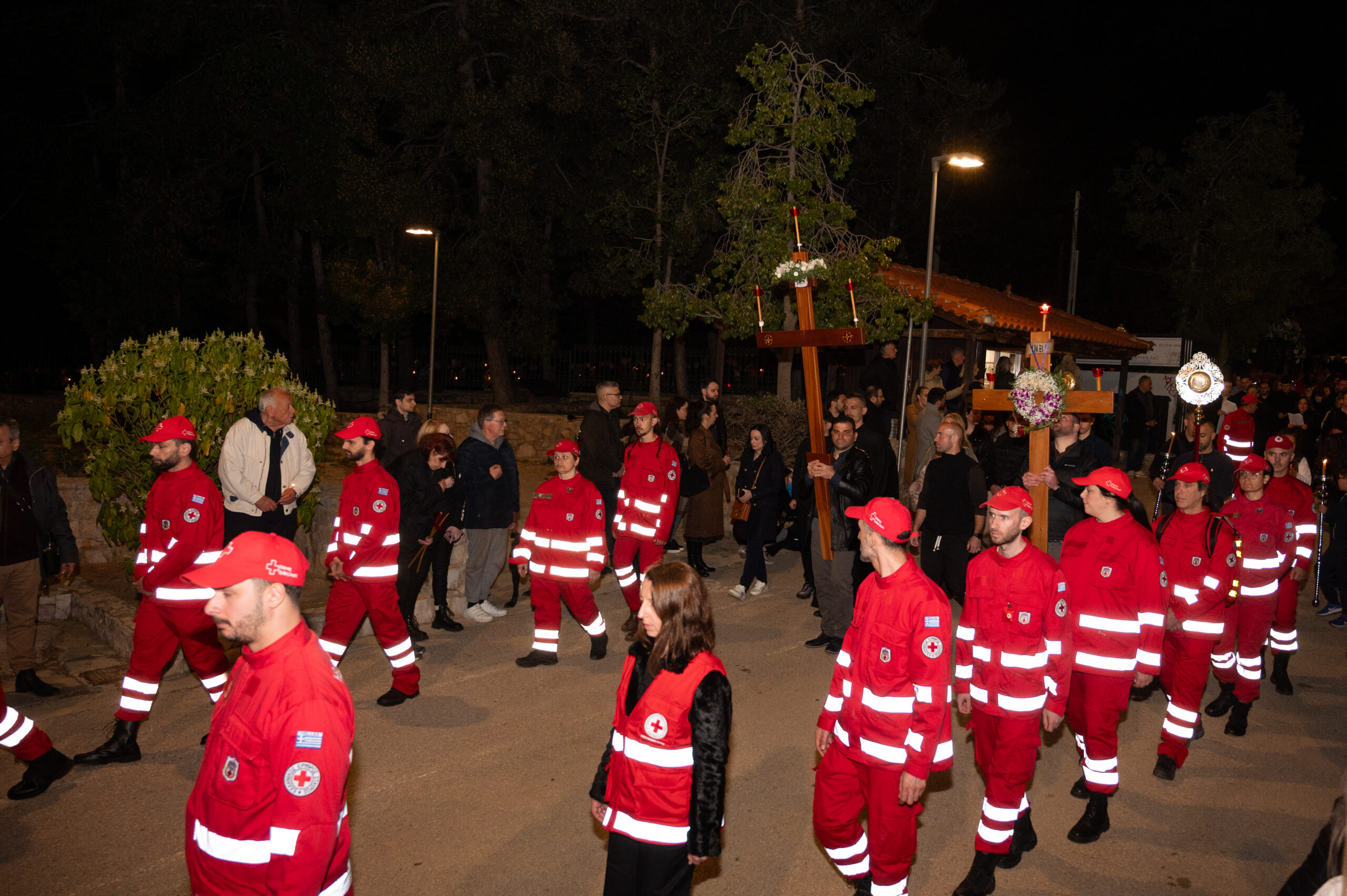 Αργότερα, κατά την περιφορά του Επιταφίου στο Άλσος, πλήθος κόσμου ακολούθησε τη λιτανεία με αναμμένα κεριά, δημιουργώντας μια ατμόσφαιρα βαθιάς συγκίνησης. Ξεχωριστή στιγμή της βραδιάς αποτέλεσε η συνάντηση δύο Επιταφίων, εκείνου της Ζωοδόχου Πηγής και εκείνου του Αγίου Ιωάννη Μαδύτου, οι οποίοι, περίτεχνα στολισμένοι, ενώθηκαν στο ίδιο σημείο προσφέροντας ένα εντυπωσιακό και συμβολικό θέαμα. Το πένθος κορυφώθηκε με τους πιστούς να ψάλλουν τα εγκώμια και ιδιαίτερα το «Ω γλυκύ μου Έαρ», εκφράζοντας το πένθος αλλά και την προσμονή της Ανάστασης. Παράλληλα, διασώστες του Ερυθρού Σταυρού βρέθηκαν στον χώρο, τιμώντας με την παρουσία τους τη σημαντική αυτή ημέρα της Χριστιανοσύνης.
