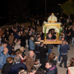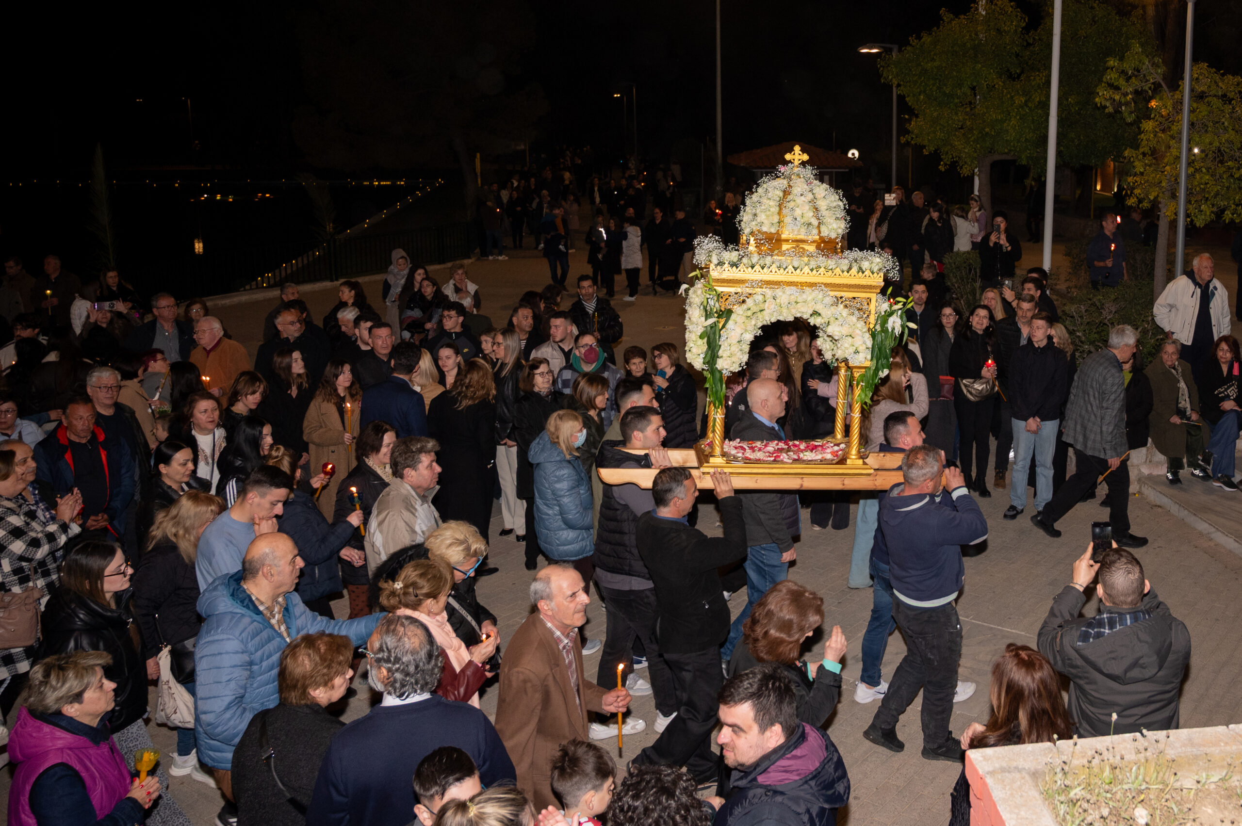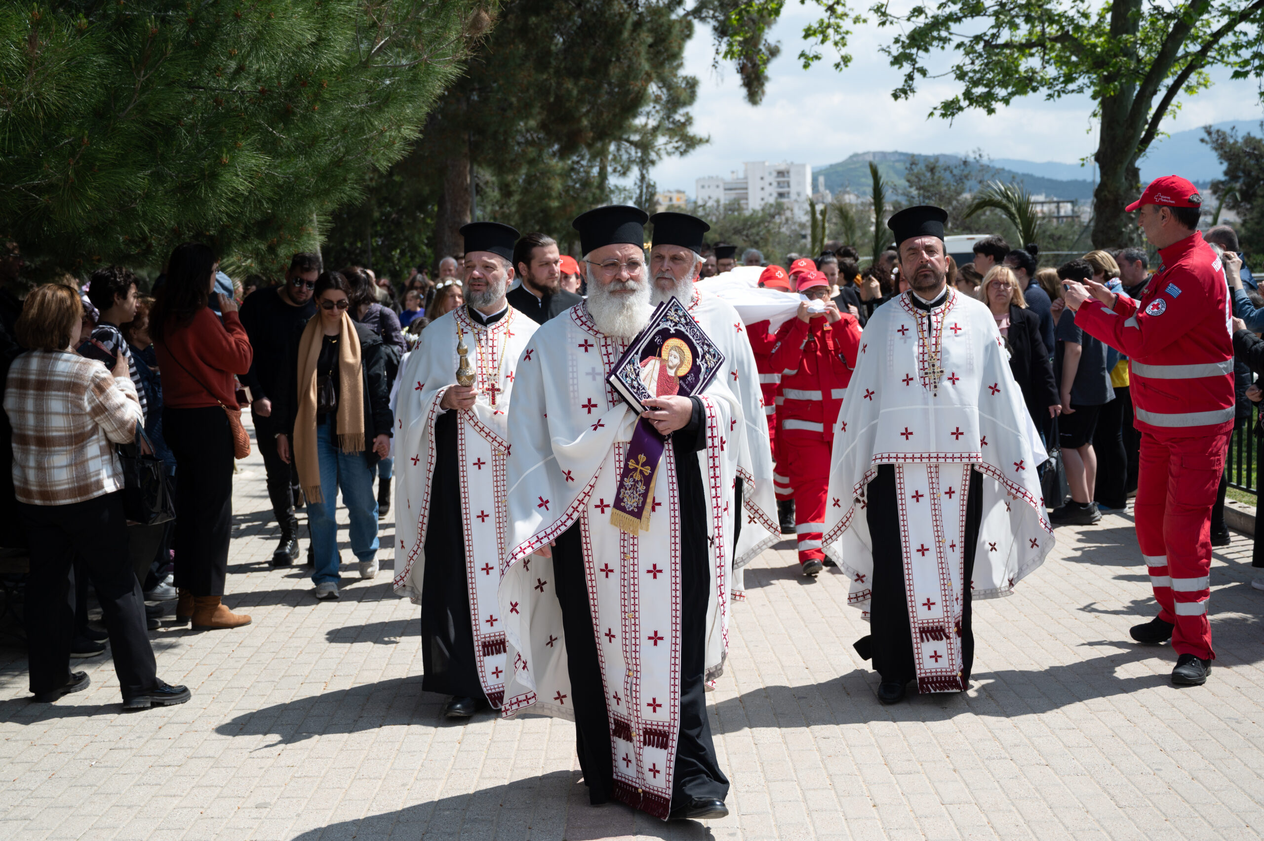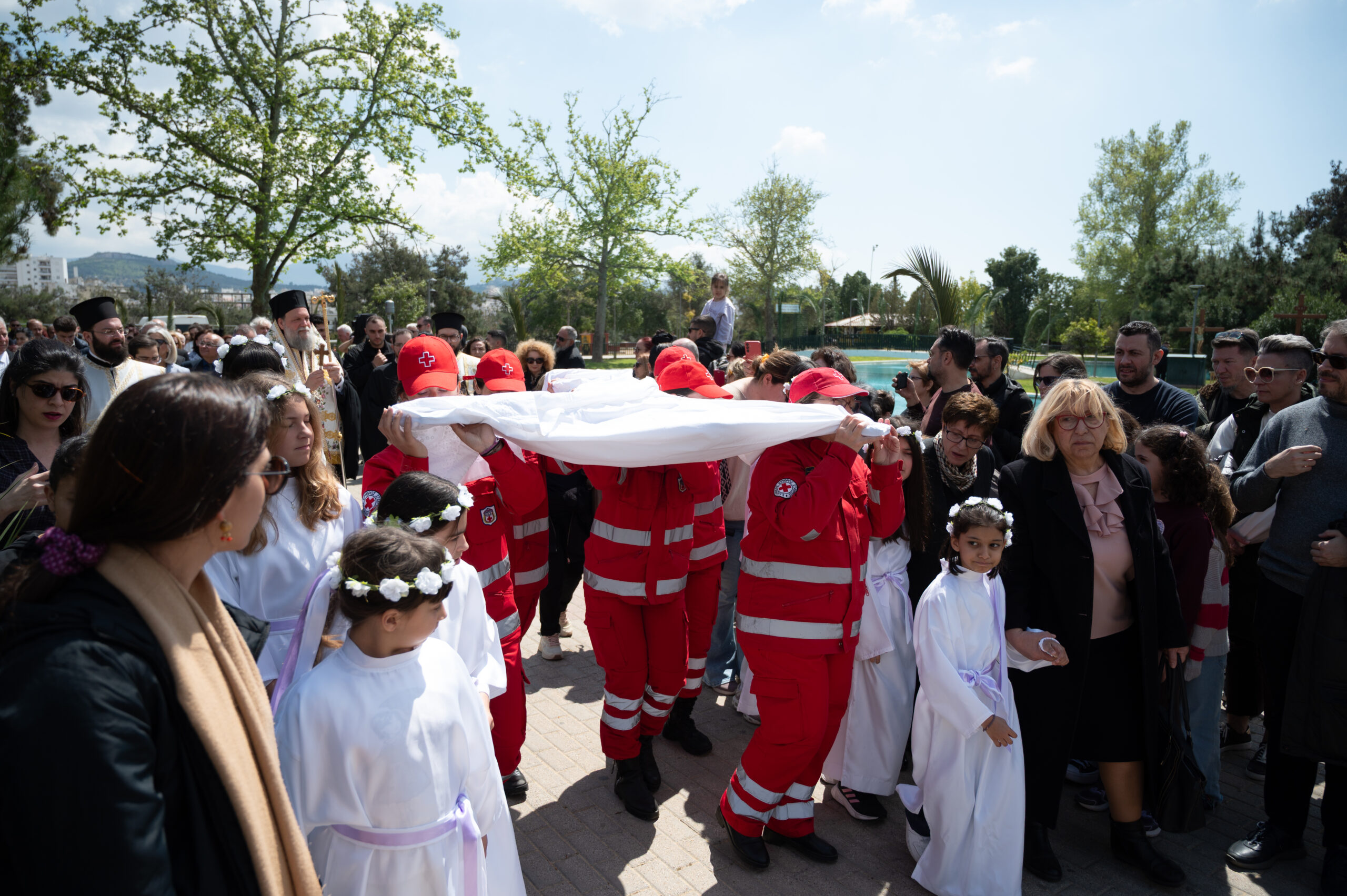 Αργότερα, κατά την περιφορά του Επιταφίου στο Άλσος, πλήθος κόσμου ακολούθησε τη λιτανεία με αναμμένα κεριά, δημιουργώντας μια ατμόσφαιρα βαθιάς συγκίνησης. Ξεχωριστή στιγμή της βραδιάς αποτέλεσε η συνάντηση δύο Επιταφίων, εκείνου της Ζωοδόχου Πηγής και εκείνου του Αγίου Ιωάννη Μαδύτου, οι οποίοι, περίτεχνα στολισμένοι, ενώθηκαν στο ίδιο σημείο προσφέροντας ένα εντυπωσιακό και συμβολικό θέαμα. Το πένθος κορυφώθηκε με τους πιστούς να ψάλλουν τα εγκώμια και ιδιαίτερα το «Ω γλυκύ μου Έαρ», εκφράζοντας το πένθος αλλά και την προσμονή της Ανάστασης. Παράλληλα, διασώστες του Ερυθρού Σταυρού βρέθηκαν στον χώρο, τιμώντας με την παρουσία τους τη σημαντική αυτή ημέρα της Χριστιανοσύνης.