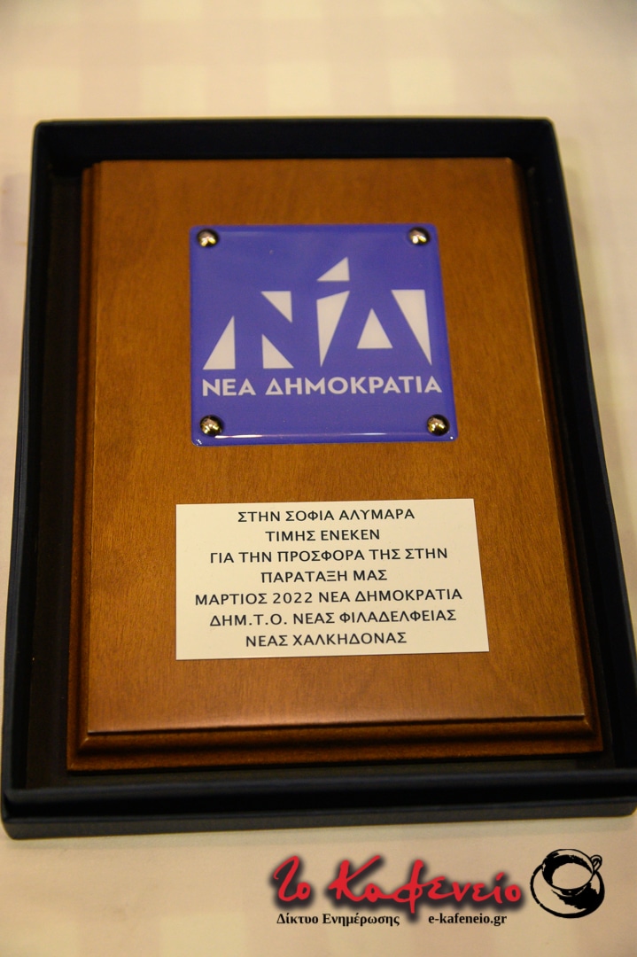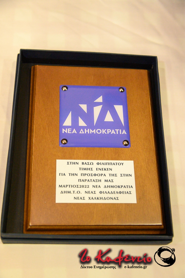Ο Πρόεδρος της ΔΗΜ.Τ.Ο. Νέας Δημοκρατίας Νέας Φιλαδέλφειας – Νέας Χαλκηδόνας Γιάννης Τομπούλογλου καλησπέρισε την εκδήλωση, ενώ το λόγο έλαβαν στη συνέχεια για έναν σύντομο χαιρετισμό ξεχωριστά στελέχη του κόμματος. Η βραδιά ολοκληρώθηκε με την Υπουργό Παιδείας και Θρησκευμάτων Νίκη Κεραμέως να απονέμει τιμητική πλακέτα στην Βάσω Φιλιππάτου – Α’ Αντιπρόεδρο Β1 ΔΕΕΠ Βορείου Τομέα Αθηνών για την διαχρονική προσφορά της στον τομέα της υγείας και στην παράταξη, καθώς και την Υφυπουργό Υγείας αρμόδια για θέματα ψυχικής υγείας Ζωή Ράπτη να απονέμει τιμητική πλακέτα στην Σοφία Αλυμάρα – Περιφερειακή Σύμβουλος Κεντρικού Τομέα Αθηνών για την δική της ξεχωριστή προσφορά.