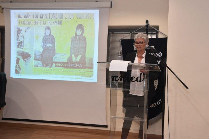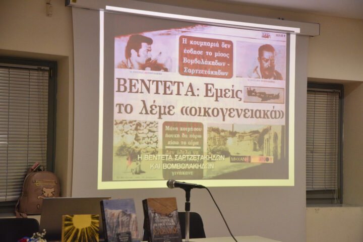 Το Σάββατο, 25 Απριλίου το απόγευμα, στην αίθουσα εκδηλώσεων του ΠΠΙΕΔ, πραγματοποιήθηκε μία πολύ ξεχωριστή εκδήλωση με ιδιαίτερη συγκινησιακή φόρτιση, η οποία αφορούσε στο κοινωνικό φαινόμενο της Κρητικής Βεντέτας, του αντίστοιχου Μανιάτικου «Γδικιωμού» και του Σασμού. Εξέχουσες προσωπικότητες διαφώτισαν την αναλυση του θέματος, ο καθένας με διαφορετική προσέγγιση. Μίλησε ηαρχαιολόγος-εκπαιδευτικός, Ελένη Στυλιανού αναφορικά με την ιστορική προέλευση της βεντέτας, ήδη από τους Ομηρικούς χρόνους, μέχρι σήμερα, όπως και για τους λόγους που αναπτύχθηκε στις περιοχές που αναπτύχθηκε, η συντονίστρια της εκδήλωσης, φιλόλογοςκαι σύμβουλος ψυχικής υγείας, Μαρλέν Σβέρκου, εξήγησε διεξοδικά τι αναπαριστά η βεντέτα για τις περιοχές που την εφαρμόζουν και ταύτισε τα ιδιαίτερα εθνικά χαρακτηριστικά με τη νοοτροπία της «αντεκδίκησης», επικεντρώνοντας την προσοχή της στην Κρήτη και τη Μάνη, στις ομοιότητες, αλλά και στις διαφορές αυτών και στη συνέχεια περιέγραψε τη διαδικασία του Σασμού. Η πρόεδρος της Ένωσης ΚρητώνΝέας Φιλαδέλφειας, κυρία Ελένη Κανατά, αναφέρθηκε στον απαράμιλλο ρόλο των γυναικών στη βεντέτα, τόσο ως μέσο αποφυγής, όσο και ως ηθικός αυτουργός. Ο αντιπρόεδρος της Παγκρητίου Ενώσεως , χοροδιδάσκαλος και ιδρυτής του Λαογραφικού Ομίλου Κρήτες, κύριος Γιώργος Πετράκης, ως άνθρωπος με άμεση σχέση με τα πολιτιστικά δρώμενα και θεματοφύλακας των ηθών και των εθίμων της Κρήτης, τάχθηκε ξεκάθαρα υπέρ της ειρήνης και καταδίκασε τις πρακτικές αντεκδίκησης, οι οποίες καταστρέφουν ολόκληρες οικογένειες και τις βυθίζουν στο πένθος. Η πρόεδρος της Ένωσης Απανταχού Μανιατών, «Η ΜΑΝΗ» κυρία Δήμητρα Κούβαρη, με τρόπο