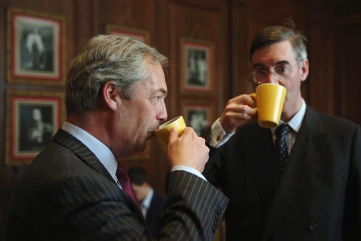 LONDON, ENGLAND – MAY 17: UKIP leader Nigel Farage and Jacob Rees-Mogg MP speak ahead of the Bruges Group press conference on May 17, 2016 in London, England. The event focused on the issues surrounding the European Arrest Warrant and how Britain would be, in the opinion of the speakers, better placed outside of the European Union. (Photo by Dan Kitwood/Getty Images)