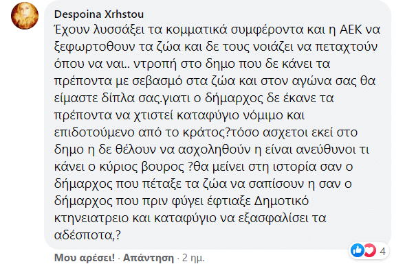 Το θέμα δεν μπορούσε να μην προκαλέσει θύελλα αντιδράσεων από τους δημότες που γνωρίζουν και στηρίζουν το έργο των εθελοντών του Φιλοζωϊκού Συλλόγου, οι οποίοι τελούν θεάρεστο έργο φροντίζοντας με αυταπάρνηση τα αδέσποτα ζωάκια της πόλης εδώ και πάνω από 17 χρόνια (!) .