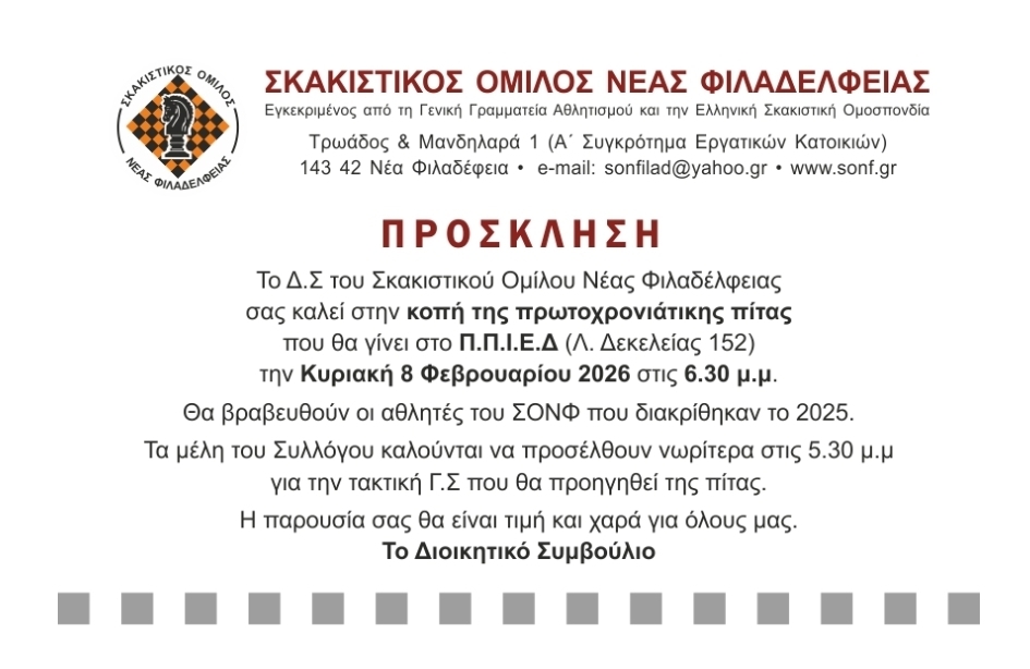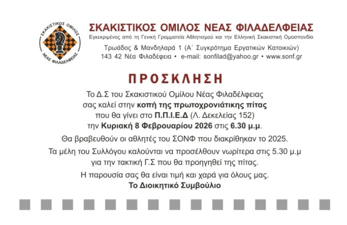 Πρόσκληση για την πρωτοχρονιάτικη πίτα από τον Σκακιστικό Σύλλογο
